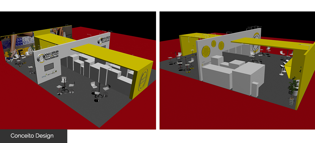 Utilizamos as cores da marca em todo o stand.